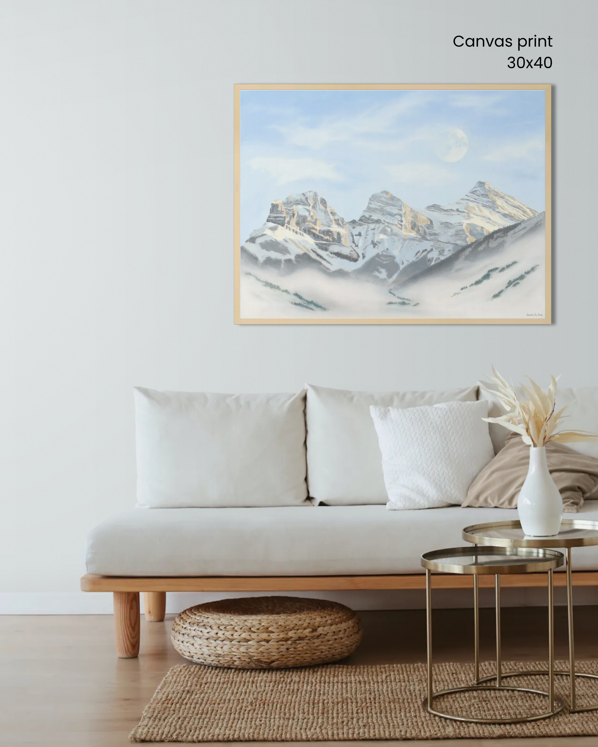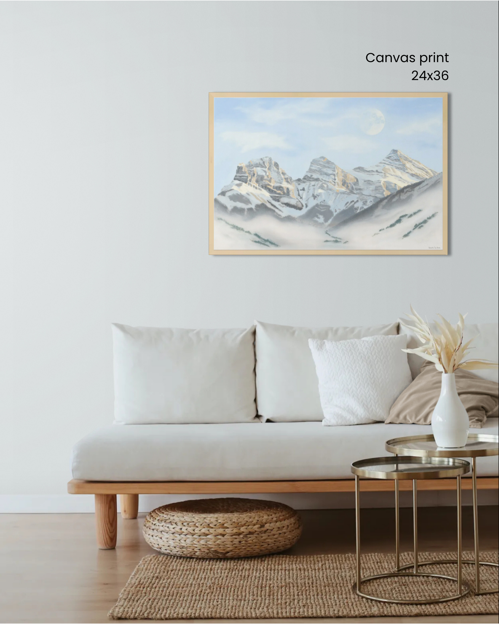 Inspired by the Three Sisters in Canmore, this piece captures that magical meeting point between towering peaks and the vast blue sky—where the moon feels impossibly close, like you could reach out and touch it. It holds the quiet awe of day turning to night.