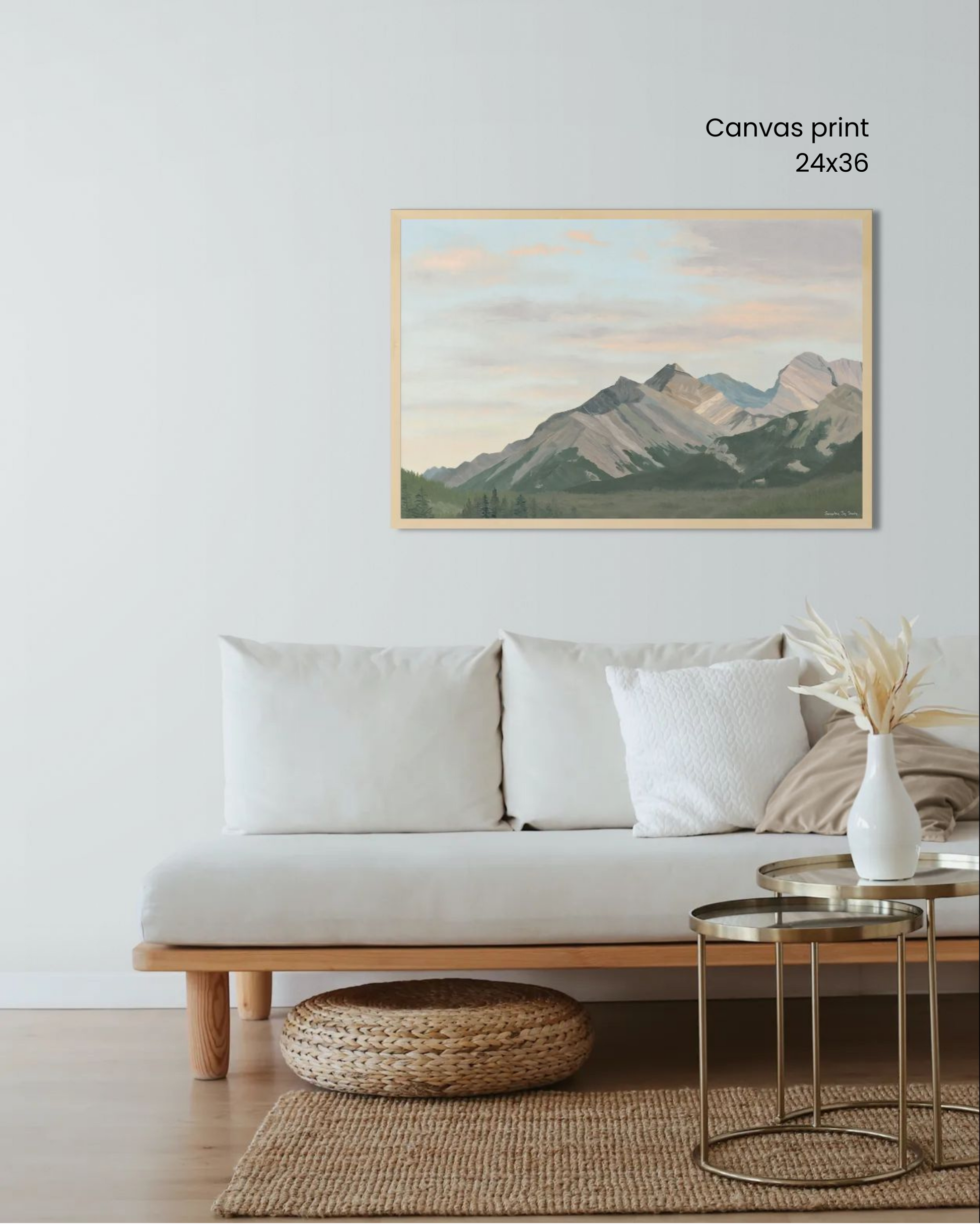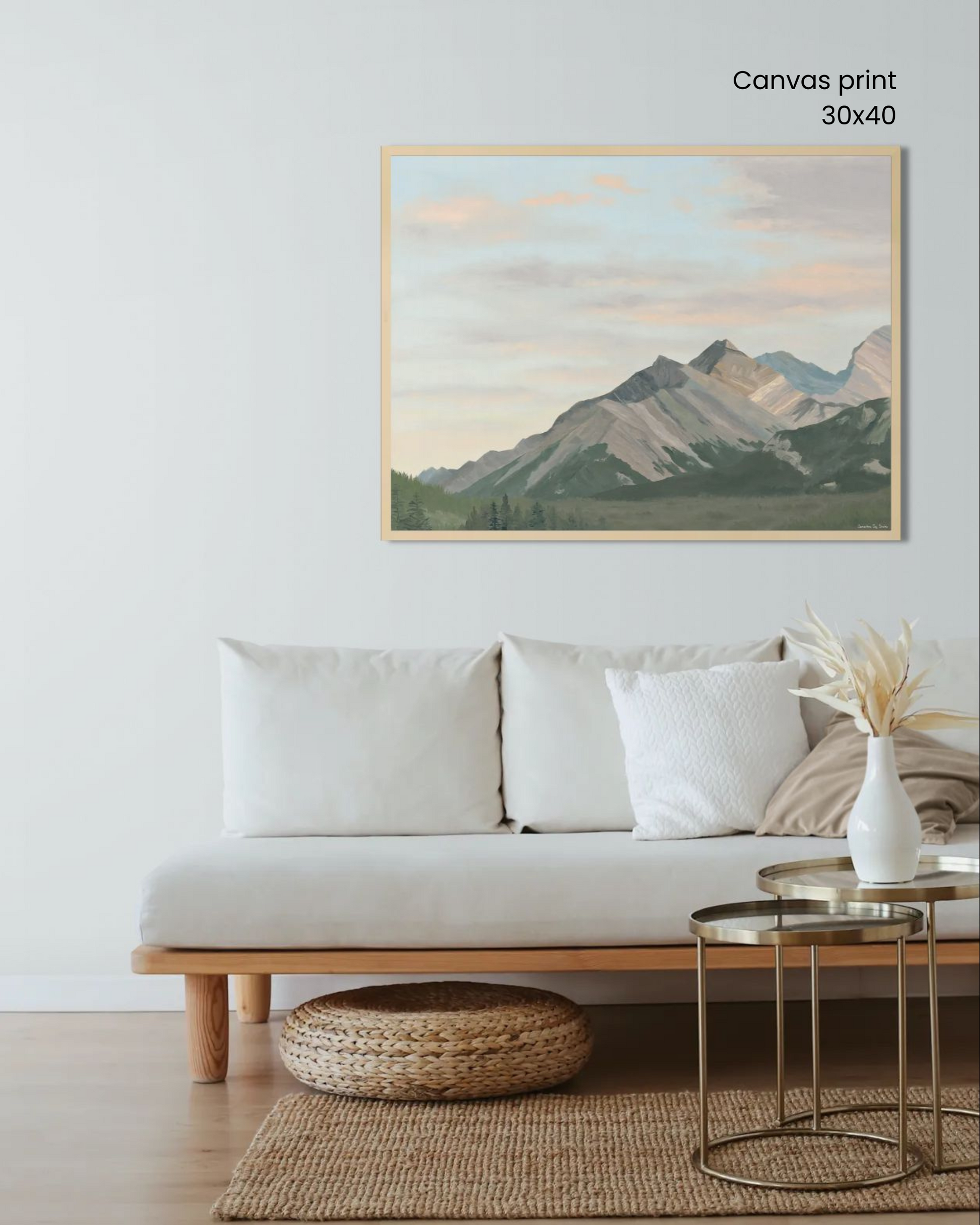 Inspired by a breathtaking sunset high in the mountains of Kananaskis, this piece captures that final moment before the light slips away—when the peaks glow with warmth and the sky holds on, just a little longer.